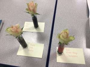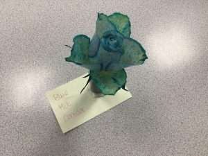 This week we have been investigating how water travels through plants. We put white roses into beakers filled with water, and added strong gel food colouring to the water, red, blue and purple. We placed one flower in the fridge, one in a sunny place and one just in the classroom. We thought about how the temperature might affect how quickly the water travels through the flower. We watched over the course of three days to see how they changed colour! We discovered that the flower with the blue food colouring in the hot place dyed more quickly, the hotter the temperature, the quicker the water travels