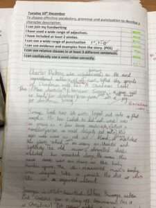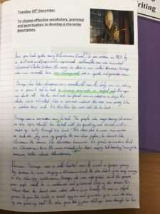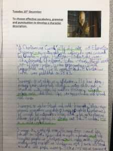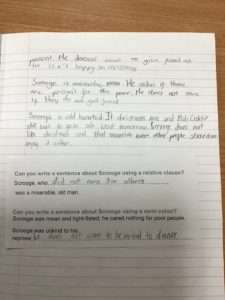 In the opening chapter to ‘A Christmas Carol,’ we met the character of Scrooge. He is such a fantastic character that we decided to write a character description. We collected fantastic words and phrases from the text – adding some of our own – to describe him. Then we had great fun constructing similes to describe his appearance. We developed these into PEE (Point, Evidence, Explain) Paragraphs and experimented with our grammar/punctuation focus for the week – relative clauses and semi colons.