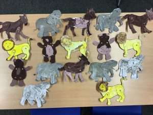 We were inspired by the mechanical animals in the story of ‘Leon and the Place Between.’ We designed and created our own versions. We chose either a lion, tiger, bear, horse or elephant to bring to life. We used cardboard templates, paint and split pins to bring our creations to life. We used black felt tip pens to add detail to our creations.