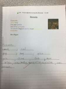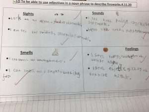We made our very own firework display with our pictures. Finally, because we are unable to go out to firework displays tonight, we turned off all of the lights and watched a fantastic firework display on the computer and we remembered all of the adjectives which we have used this week in our poetry sessions.