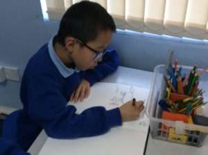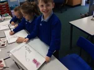 We had so much fun today creating our own Stone Age Cave art. We looked at examples from real Stone Age caves and thought about the different art materials Stone Age people would have had to use, they definitely would of made use of anything they had! We crushed different berries to get different colours and used charcoal and oil pastels instead of mud. We thought about what they would of drawn – animals and battles.