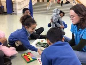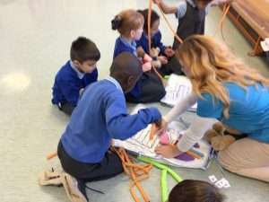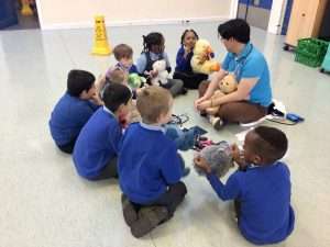 We had a wonderful visit from the Teddy Bear Hospital this afternoon! The Teddy Bear Hospital is made up of medical students from Newcastle University. We took part in four different activities: healthy eating and exercise, inside my body, sensory play and what to expect at the doctors or hospital. We arranged the internal organs inside an apron of the body, learnt a little bit of sign language and tried some activities blind folded, to test our senses. We also had a look at some doctor’s equipment including stethoscope, heart rate monitor and blood pressure monitor.