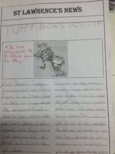 We used the text to develop a character profile about Tuffy: the cat in the story. We used our knowledge of adjectives to describe the characteristics of Tuffy and explained with reference to the text, why we had chosen these adjectives to describe Tuffy.