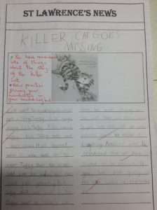 We then wrote our newspaper article about The killer Cat, remembering what we had learnt about how newspapers are presented. We made references to the text throughout our articles.