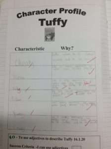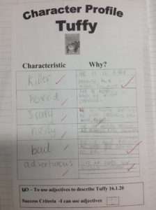 We used the text to develop a character profile about Tuffy: the cat in the story. We used our knowledge of adjectives to describe the characteristics of Tuffy and explained with reference to the text, why we had chosen these adjectives to describe Tuffy.
