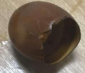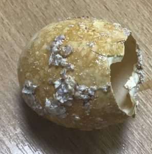 Here are the eggshells we left in tap water (left) and our control egg, which we left in nothing (right). We noticed how the eggshell in water was only slightly discoloured compared to the control egg.