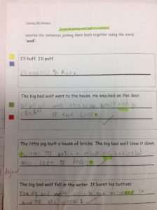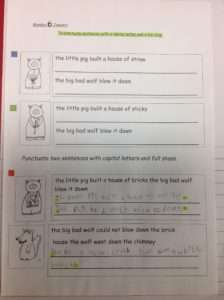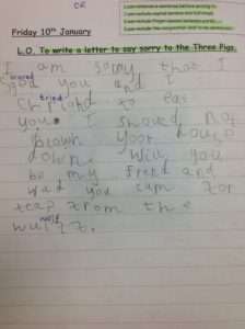 The children were then ready for their Big Write. Their task was to write a sorry letter from the wolf to the Three Little Pigs. They were asked to correctly punctuate their sentences with capital letters and full stops and join two sentences together using the conjunction ‘and’.