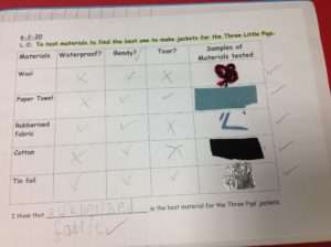 We then carried out an investigation to find the best material for making a jacket for the Three Little Pigs whilst they were building their houses in extreme weather. The children tested materials to see if they were waterproof, flexible and durable.