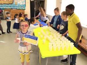 The Mini Vinnie members and the School Councillors sold juice and biscuits to raise money and everyone donated £1 towards the appeal.